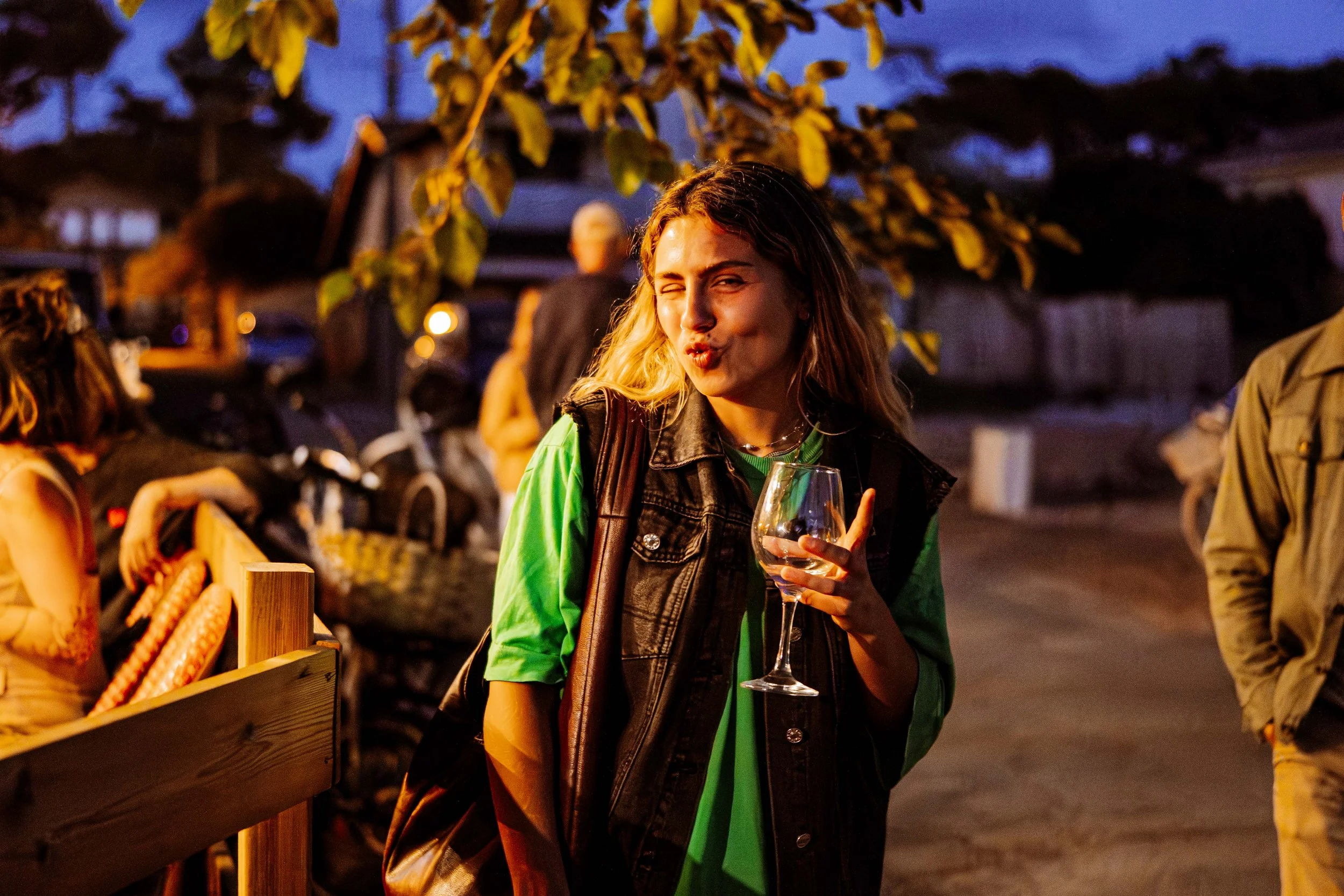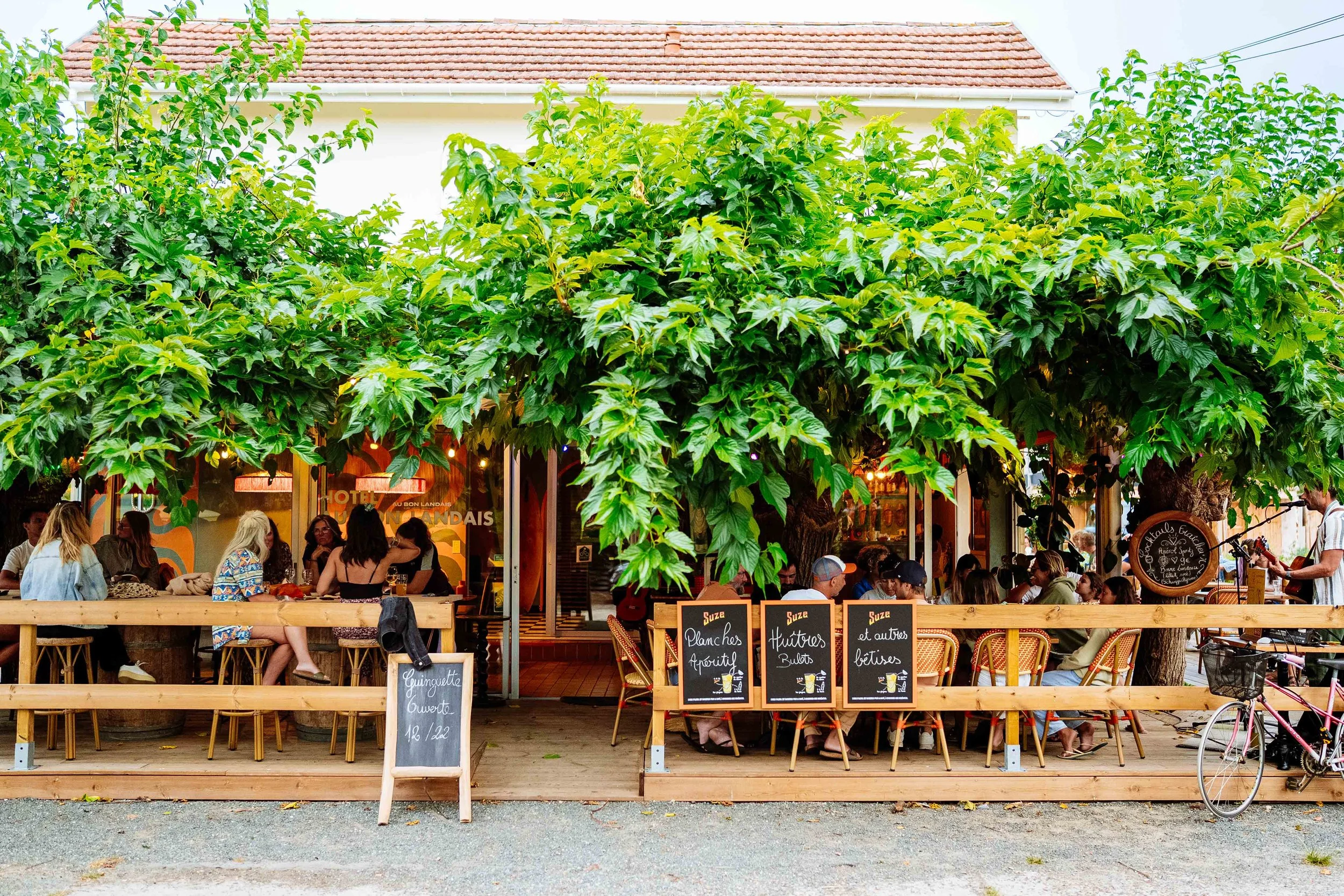 À la tombée de la nuit, Le Bon Landais se métamorphose. Les lumières s’adoucissent, la musique s’invite, et l’hôtel prend des allures de guinguette joyeuse où l’on se retrouve pour profiter de la douceur des soirées landaises.